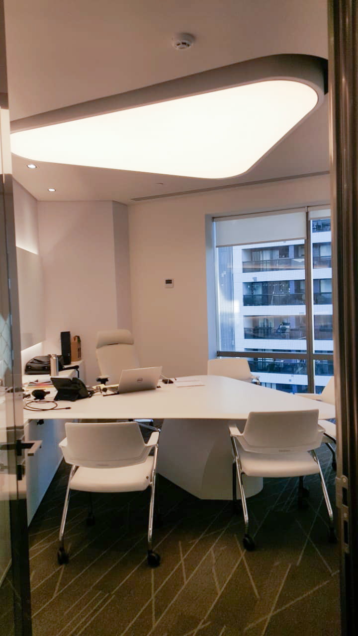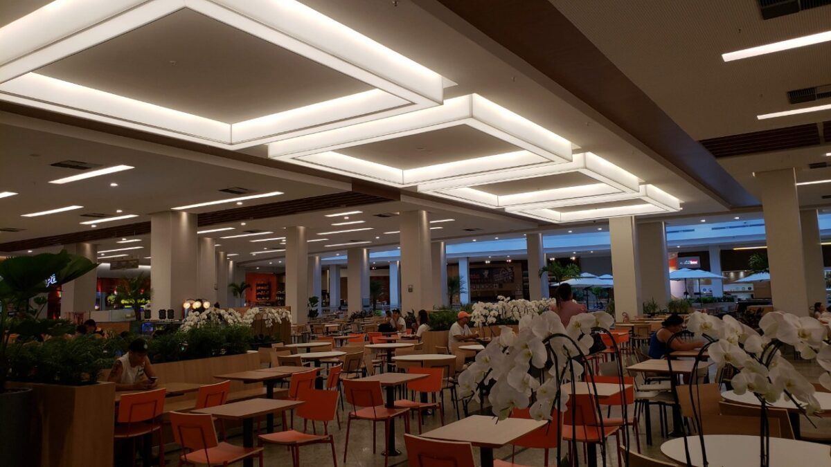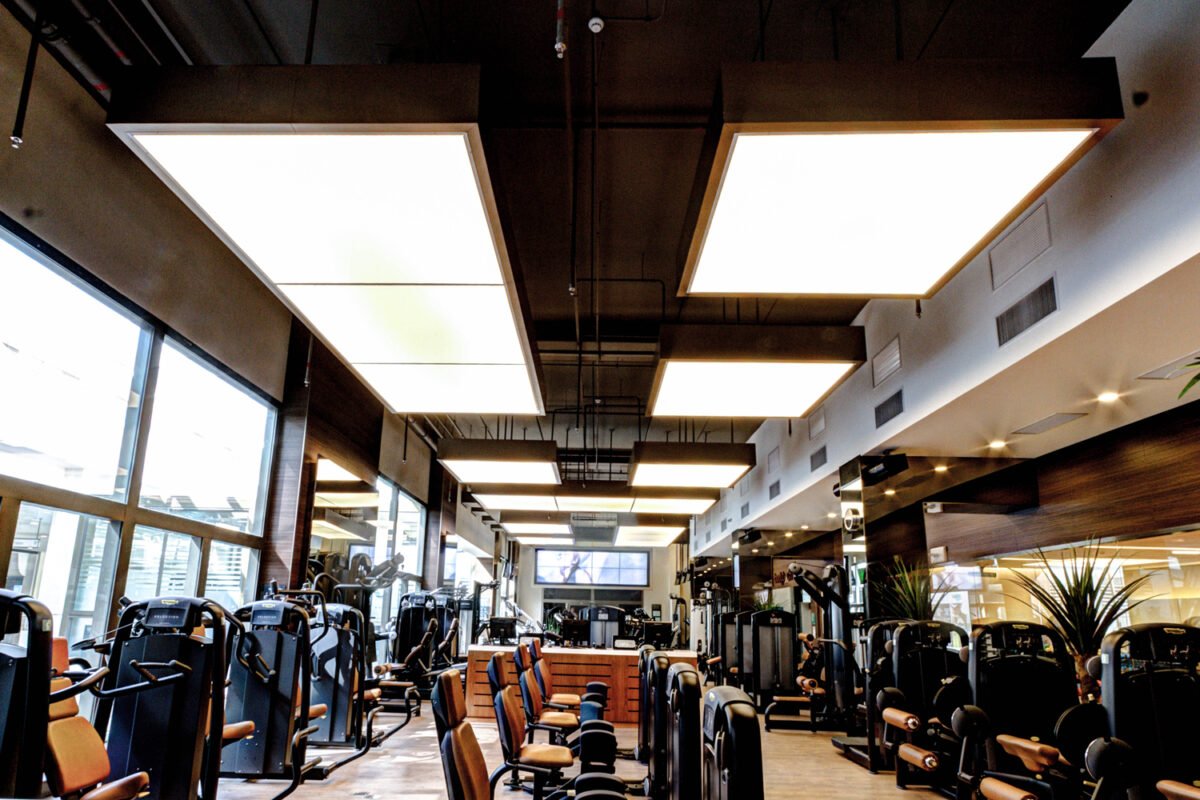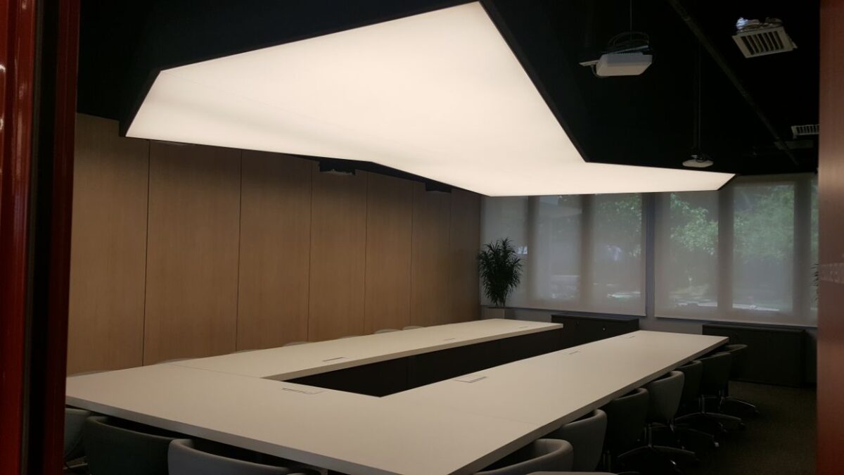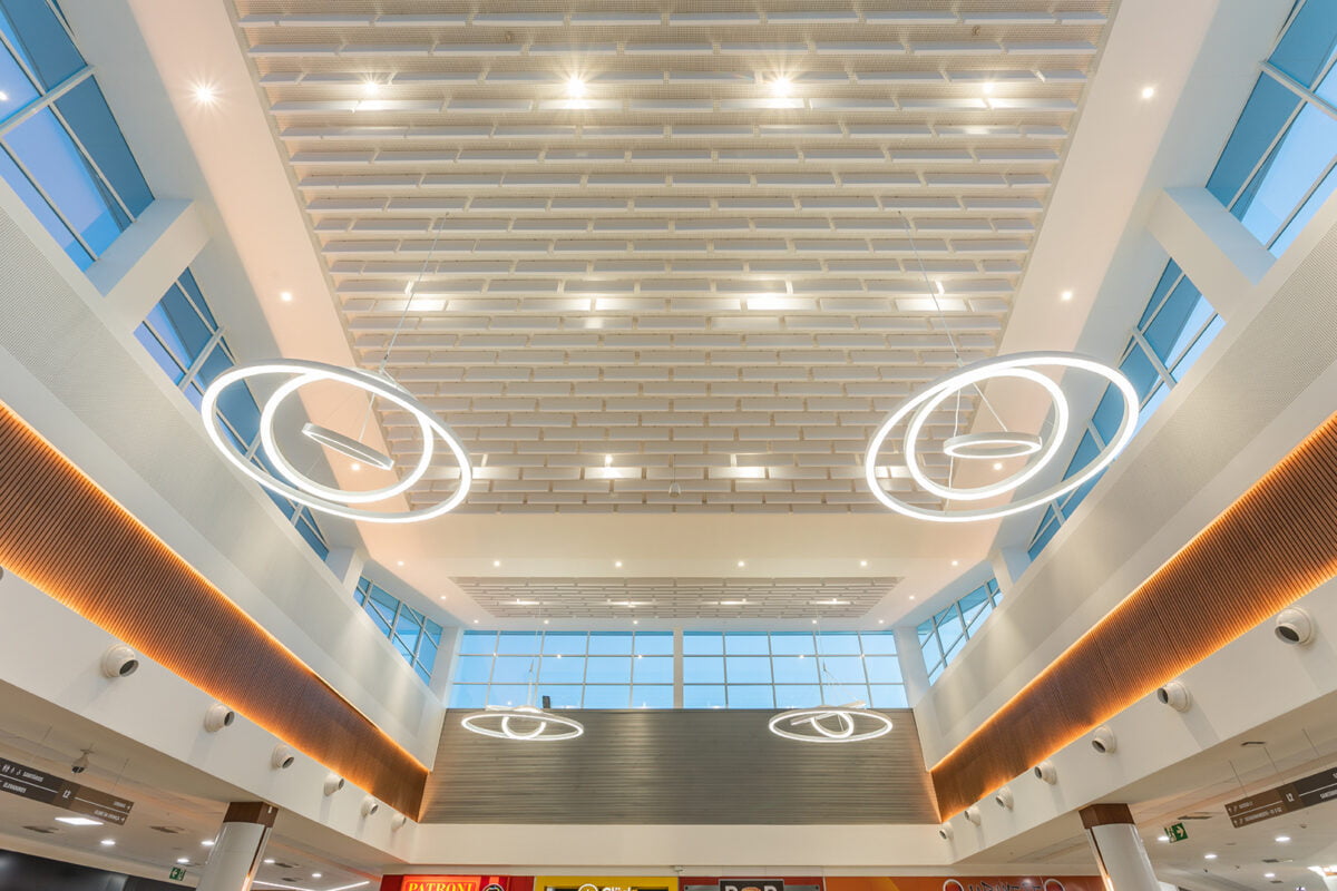 Pendant Luminaires formed by circular structures produced with Tensoflex aluminum profile, electrostatic painting, translucent films and perimetral LED strips.
